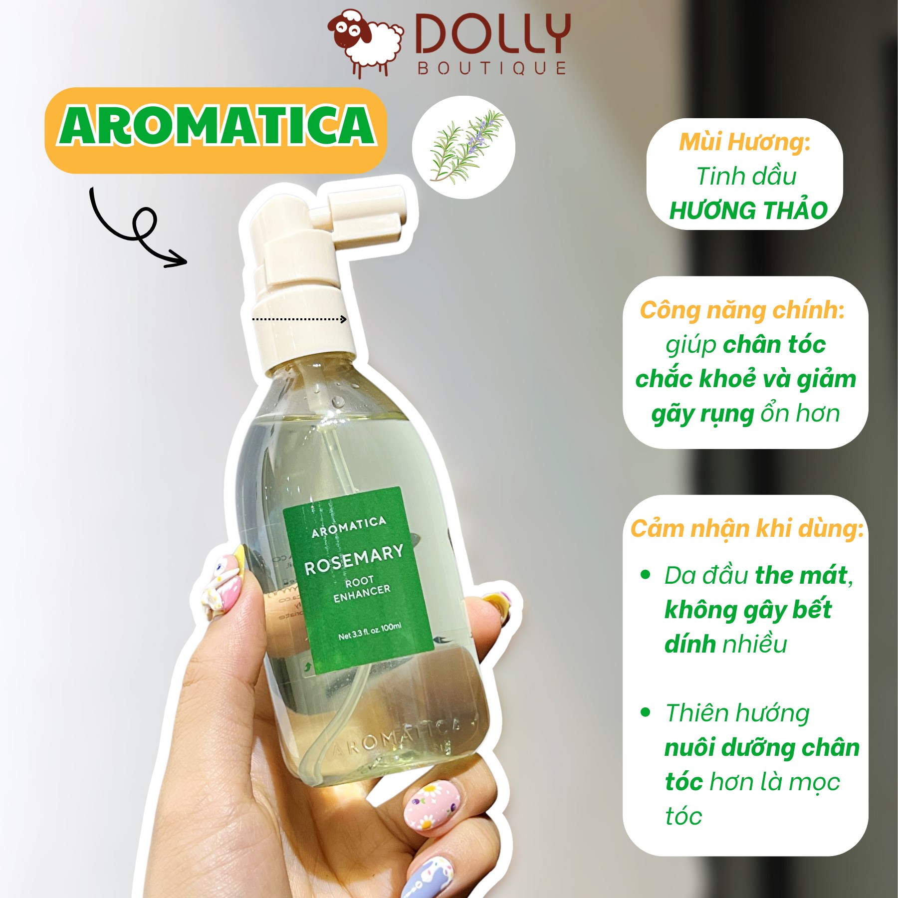 - Xịt Dưỡng Tóc Hương Thảo Aromatica Rosemary Root Enhancer chứa các thành phần nổi bật như lá hương thảo, Bifida Ferment Lysate và Biotin có tác dụng giúp kích thích mọc tóc mới và giúp giảm thiểu tình trạng rụng tóc; cung cấp dưỡng chất cho tóc và giúp tăng cường sức sống cho tóc; có khả năng làm sạch da đầu, loại bỏ bã nhờn và ngăn ngừa gàu, đồng thời giúp duy trì độ ẩm cho da đầu và tóc; có chứa các dưỡng chất thiết yếu giúp tóc trở nên mềm mượt và sáng bóng hơn.