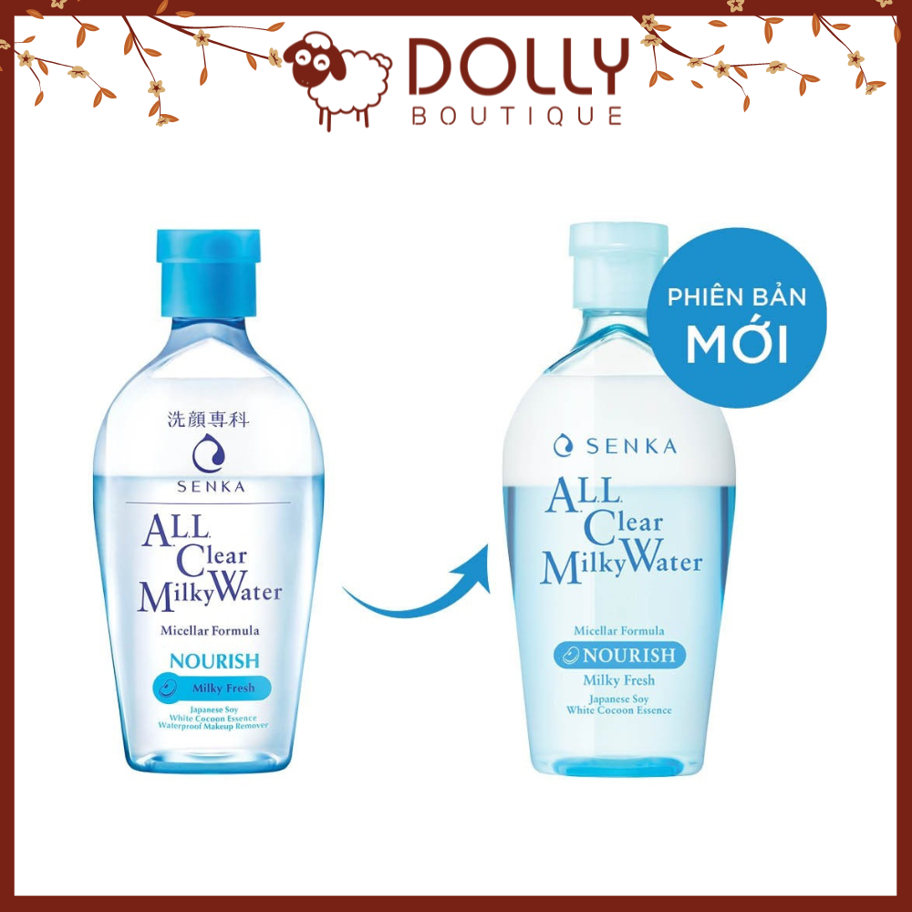 + Nước Sữa Tẩy Trang Senka All Clear Milky Water Nourish Hai Lớp 230ml giúp làm sạch sâu lớp trang điểm lâu trôi, tế bào da chết, bụi bẩn, bã nhờn, dầu thừa bên trong lỗ chân lông mà không để lại cảm giác nhờn rít hay gây khô da.