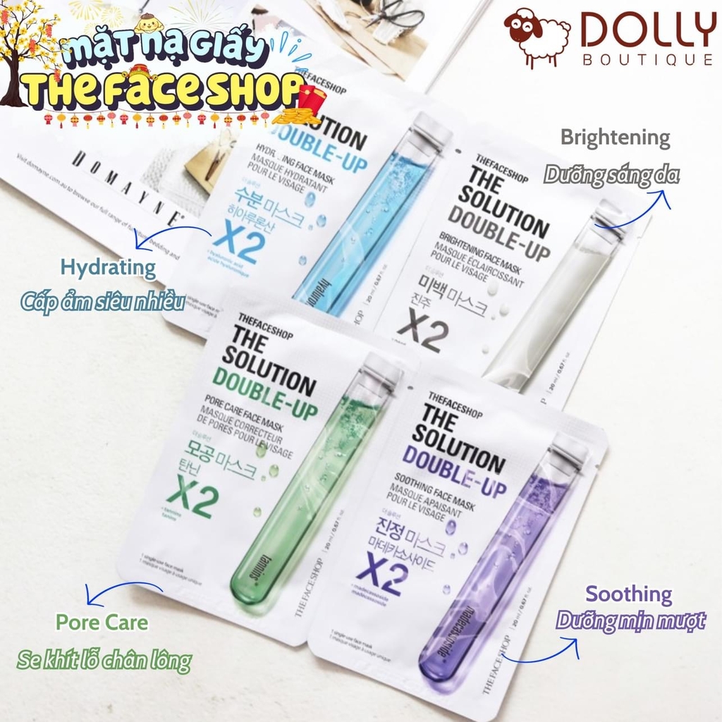 - Mặt nạ giấy The Solution Double Up Hydrating Face Mask Cung cấp độ ẩm đã bị mất đi ở da, giúp da mềm, căng mịn. Phục hồi sắc da tối màu, giúp làn da tươi sáng, mịn màng và tươi trẻ sau khi sử dụng.