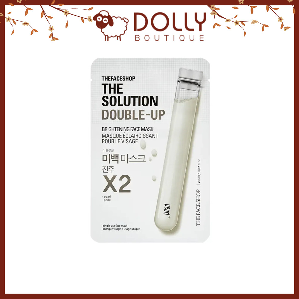 - Mặt nạ giấy The solution Double Up Brightening Face Mask được chiết xuất chủ yếu từ tinh chất ngọc trai giúp bạn có làn da trắng sáng, cải thiện vùng da tối màu. Làn da mịn màng và tươi trẻ hơn sau khi sử dụng.