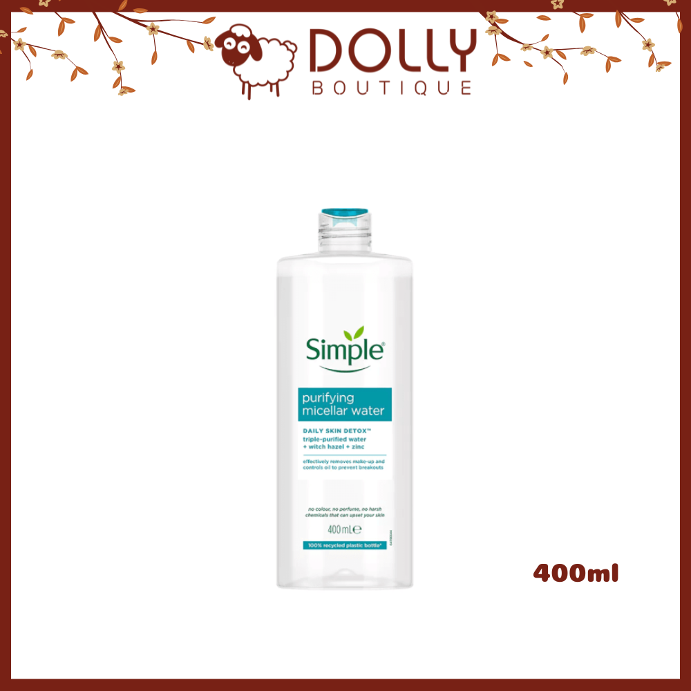 - Nước Tẩy Trang Simple Purifying Micellar Water Cho Da Mụn mang đến gấp 3 tác động làm sạch khi loại bỏ 99% vi khuẩn gây mụn, cặn trang điểm và dầu nhờn trên da, là lựa chọn lý tưởng cho làn da dầu mụn, giúp se khít lỗ chân lông, kiểm soát bóng nhờn và duy trì độ ẩm, mang lại làn da sạch mịn.